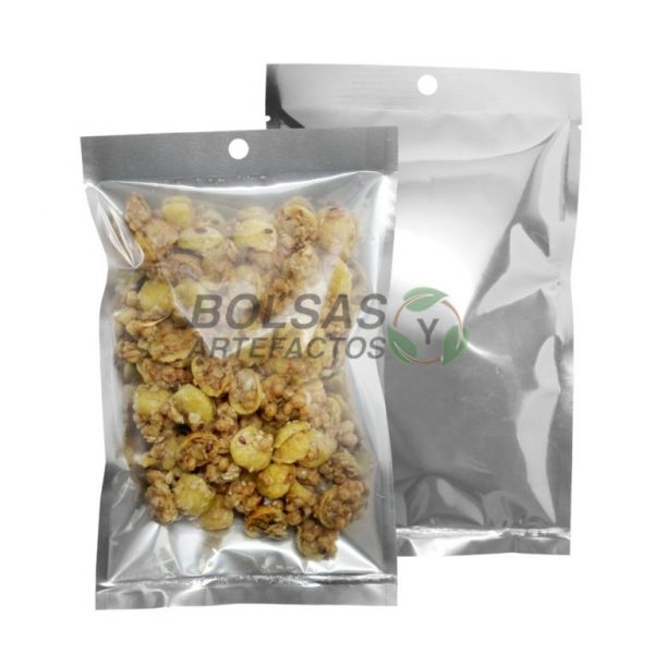 Bolsa Pouch Plano sellado por tres lados, sin lados ni fuelle. Metalizado por un lado y transparente por el otro, con ojal