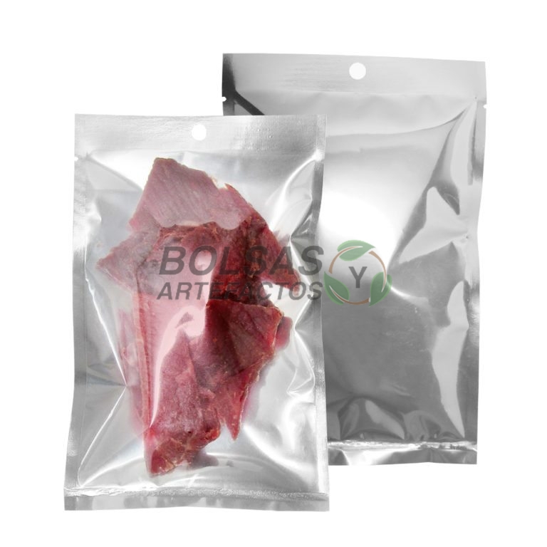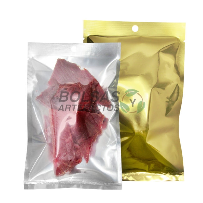 Bolsa Pouch Plano sellado por tres lados, sin lados ni fuelle. Metalizado por un lado y transparente por el otro, con ojal